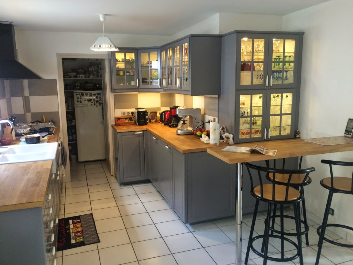 Nos clients souhaitait moderniser leur salon et cuisine ouverte, sans pour autant aller trop loin en créant une décoration qui ne leur conviendrait pas. Leur volonté ? Pas de meubles de cuisine laqués, mais plutôt une cuisine à l'allure classique, un aménagement très pratique avec beaucoup de rangements, un bar pour pouvoir y déjeuner de temps en temps et prendre l'apéro en famille.
